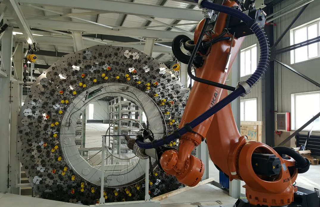 采用大規(guī)模機(jī)械臂裝置,通過(guò)控制面板輸入編織程序,自動(dòng)完成對(duì)碳纖維、芳綸纖維等高性...